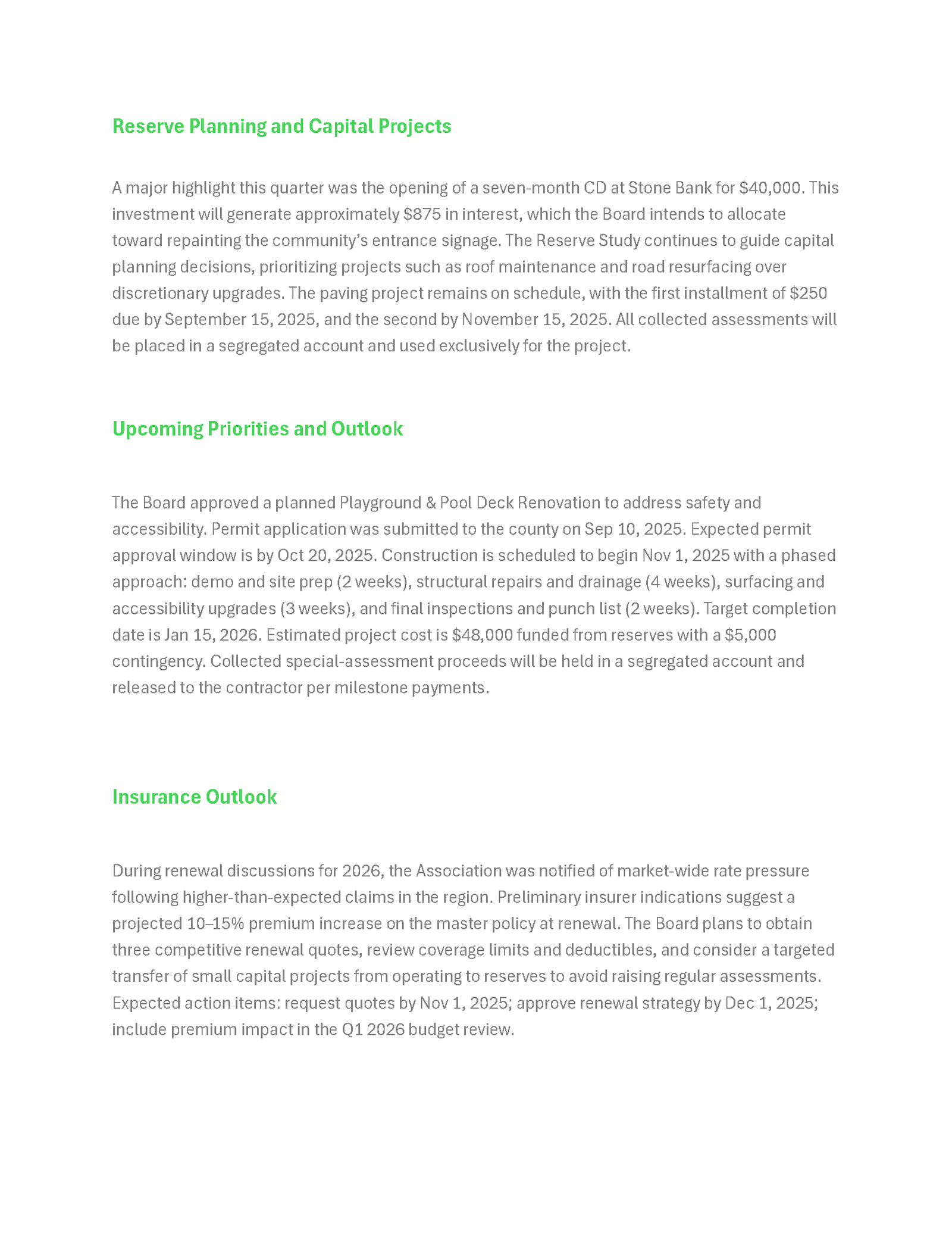 Your board receives clean, organized reports every monthβpresented in a simple and easy-to-read format.